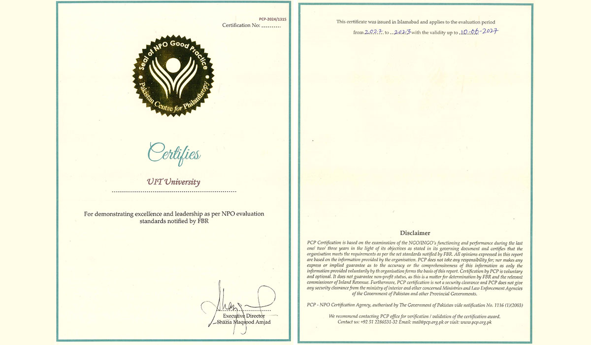 Achievement Award of Seal of NPO Good Practice by PCP Award of Seal of NPO Good Practice by PCP UIT University has been awarded the prestigious Seal of NPO Good Practice by the Pakistan Centre for Philanthropy. This recognition... Read More