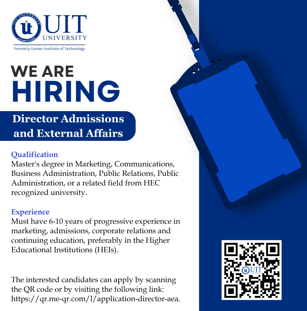 UIT University (UITU) invites applications for the position of “Director Admissions & External Affairs” who will be responsible for leading the University’s efforts in admissions, marketing, corporate relations, and continuing education. This role ensures the development and execution of strategic initiatives to enhance the University’s visibility, enrollment, industry partnerships, and community engagement. The incumbent will […]