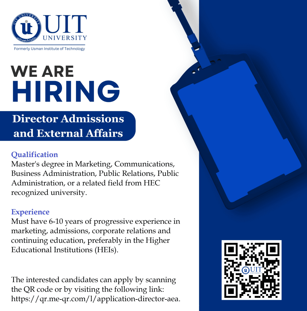 UIT University (UITU) is established vide The University Act, 2017 of Government of Sindh. The University is the culmination of thirty years of progressive and successful operation of the Usman Institute of Technology. In order to intensify the existing strength of the faculty base, we are looking for Professor, Associate Professors, Assistant Professors, Professors of […]