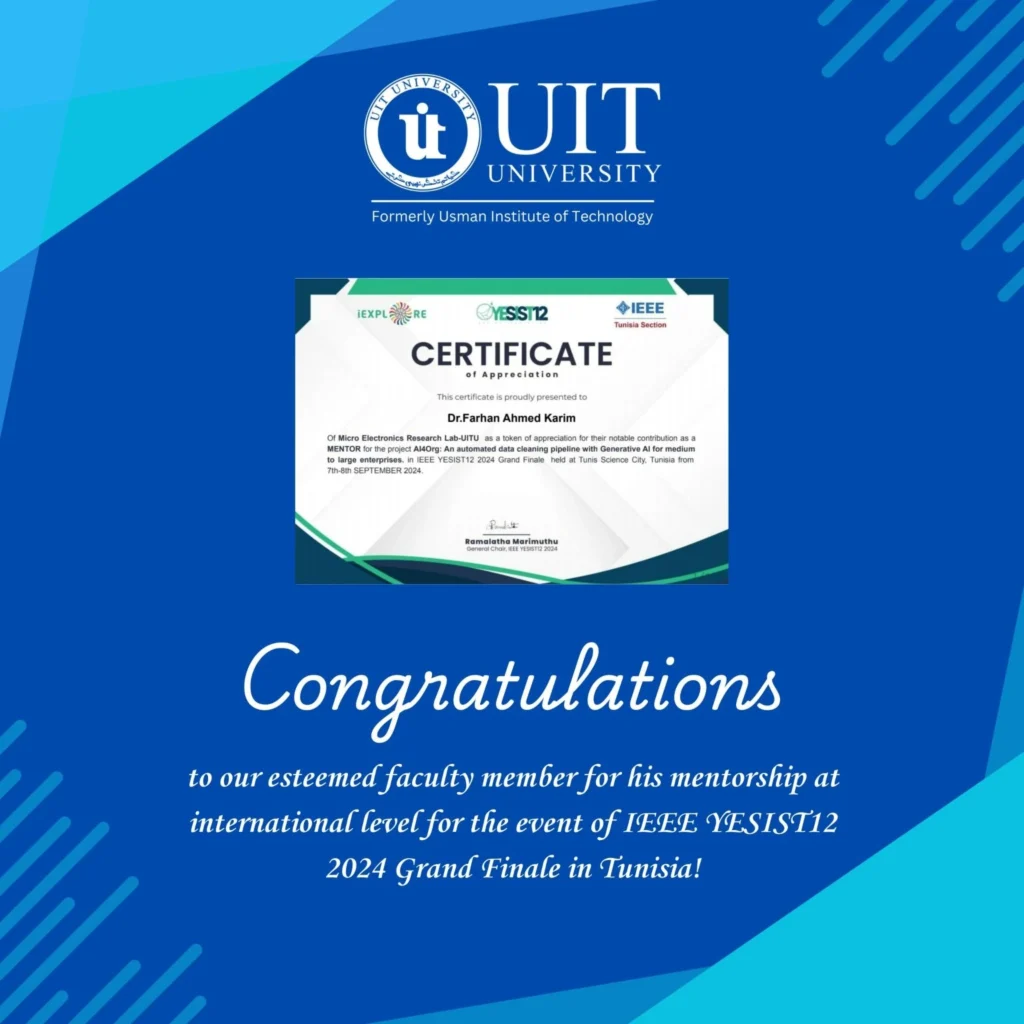 UIT University takes pride in announcing that Dr. Farhan Ahmed Karim, an esteemed faculty member of the Micro Electronics Research Lab (MERL), represented the university at the IEEE YESIST12 2024 Grand Finale in Tunis Science City, Tunisia.